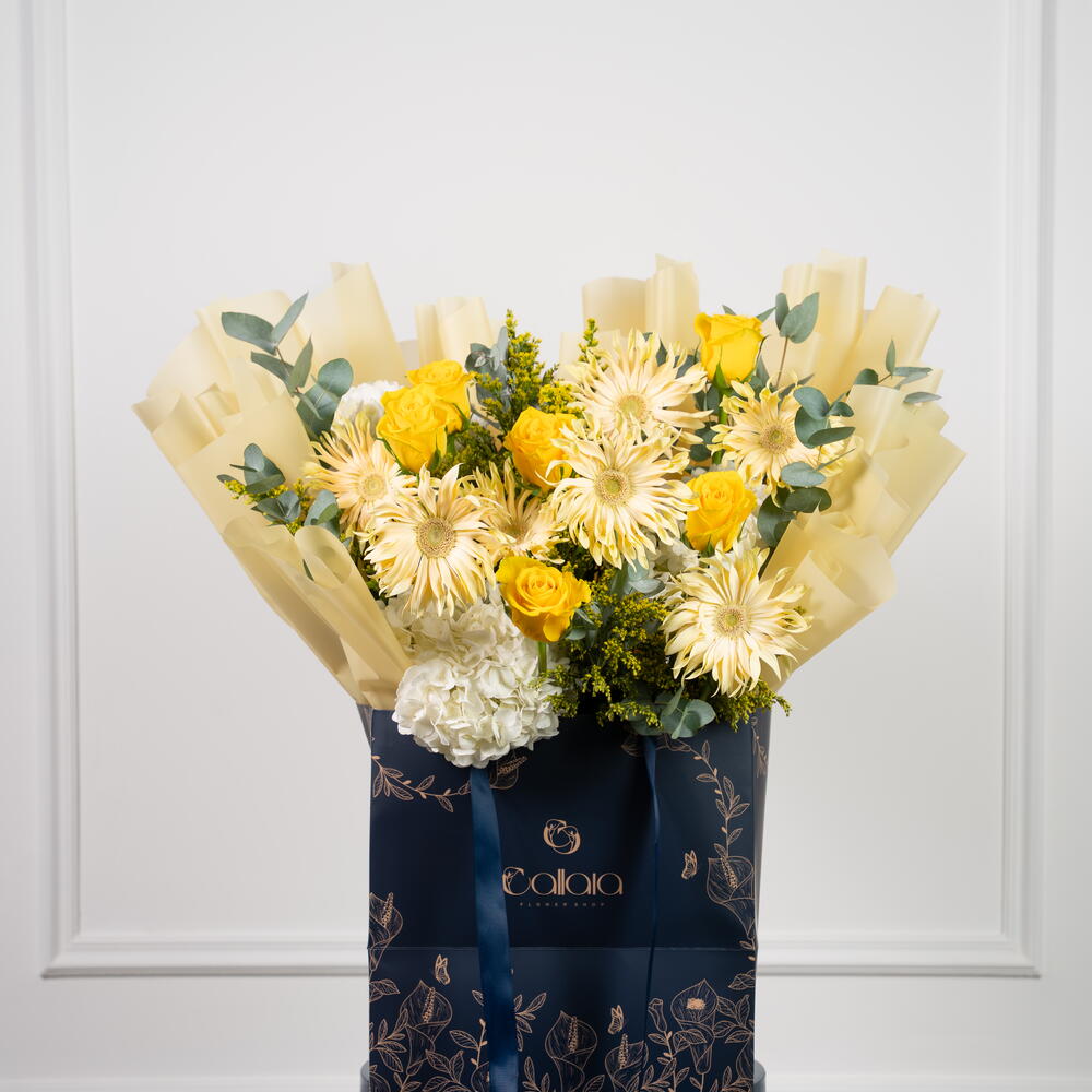 Lunaria – Un rayon de soleil en fleurs Lunaria est une explosion radieuse de tons jaunes et crème, conçue pour apporter joie, positivité et lumière à tout espace. Cette composition joyeuse met en scène des roses jaune vif, du solidago doré et des gerberas carbonara crème, adoucis par des hortensias blancs et de l'eucalyptus pour un équilibre frais et élégant. Présentée dans le luxueux sac signature de Callaia, Lunaria est le cadeau idéal pour égayer la journée de quelqu'un.