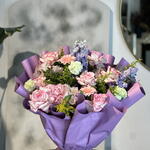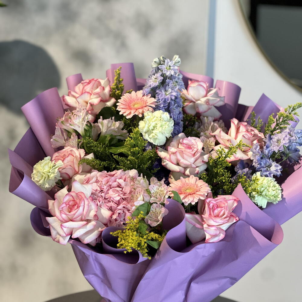 Hydrangea - 2 pce Alstroemeria - 3 pce Solidago - 6 pce Gerbera - 2 pce rose - 7 pce carnation - 3 pce delphinium - 2 pce