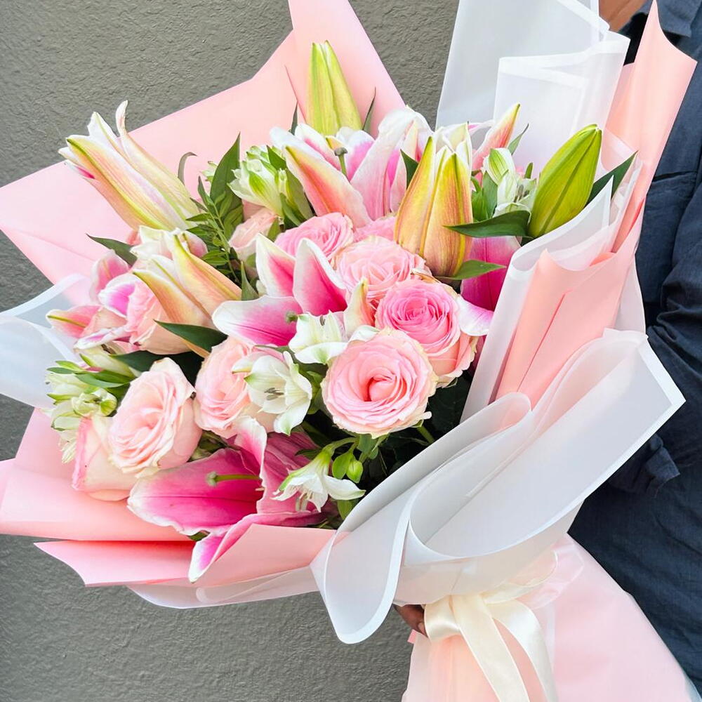 alstroemeria white - 4 pce rose - 7 pce wrapping paper - 6 pce lys rose - 4 pce