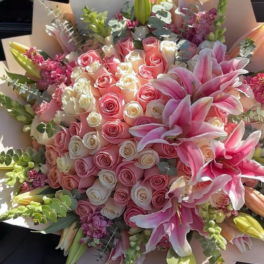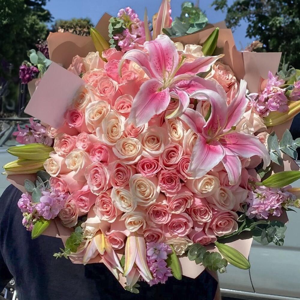 Une harmonie exquise de douceur élégante et de charme intemporel, est un grand bouquet conçu pour envoûter. Avec le délicat parfum de matthiola, la grâce des lys blancs, le romantisme des roses rose poudré et la chaleur crémeuse des roses pêche Vandela, cet arrangement surdimensionné est l'expression parfaite de la sophistication et d'une profonde affection. Idéal pour des surprises en voiture de luxe, pour marquer des étapes importantes, ou simplement pour faire sentir quelqu'un vraiment spécial.