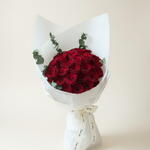 Le bouquet est une composition épurée et élégante de roses luxuriantes d'un rouge profond, serrées les unes contre les autres, encadrées par de délicates branches d'eucalyptus qui ajoutent un doux contraste vert. Les fleurs sont enveloppées dans un papier blanc immaculé plié en un cône triangulaire net, et les tiges sont nouées par un ruban blanc lisse, donnant à l'ensemble une sensation minimaliste et luxueuse qui met en valeur la beauté éclatante des roses.
