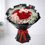Un bouquet romantique de roses d'un rouge profond et d'un rose pâle, délicatement entourées de gypsophile et enveloppé dans un papier noir élégant avec un ruban rouge pour une finition audacieuse et élégante.
