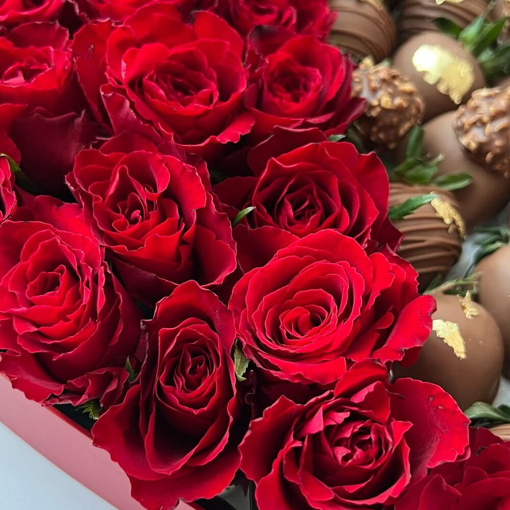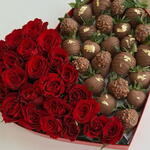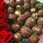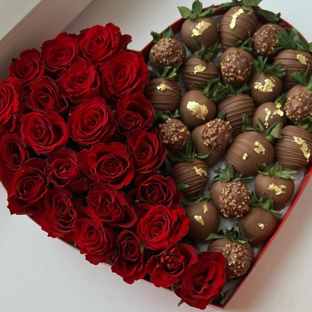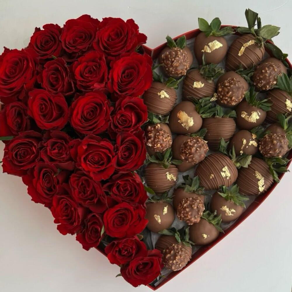 Une élégante boîte en forme de cœur mettant en vedette de fraîches roses rouges premium et des fraises artisanales enrobées de chocolat, rehaussée d'accents Ferrero Rocher et de délicats détails dorés. Un cadeau audacieux et luxueux pour la Saint-Valentin conçu pour impressionner au premier regard. Parfait pour la Saint-Valentin, les demandes en mariage, les anniversaires et les surprises romantiques exclusives. Préparé frais pour une qualité haut de gamme et une présentation impeccable. Ingrédients Fraises fraîches Enrobage au chocolat au lait Morceaux de chocolat Ferrero Rocher Décoration en or comestible