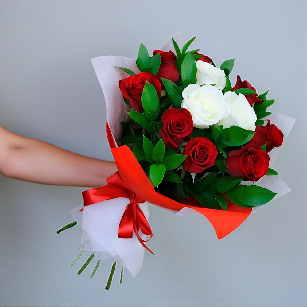 Ruban rouge - 1 pce emballage blanc - 1 pce emballage rouge - 1 pce red roses - 12 pce roses blanches - 3 pce russes - 7 pce