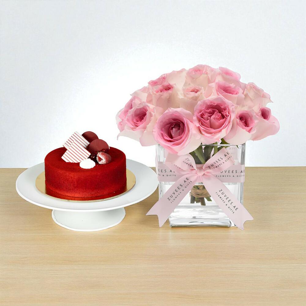 pink roses - 20 pce vase en verre 12x12 - 1 pce gâteau red velvet classique - 500 g