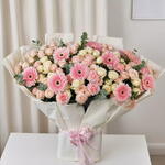 Ce magnifique Mono Bouquet est une vague radieuse de couleurs vibrantes et de finesse délicate. La chaleur de 10 gérberas en fleurs est parfaitement équilibrée par une masse opulente de 100 tendres mini-roses. Agencé avec art, ce bouquet peut être un cadeau émouvant ou une magnifique pièce maîtresse, rehaussant la beauté de chaque occasion. C'est un rappel classique de la précieuse simplicité de la vie, tout en ajoutant une touche d'élégance et de charme.