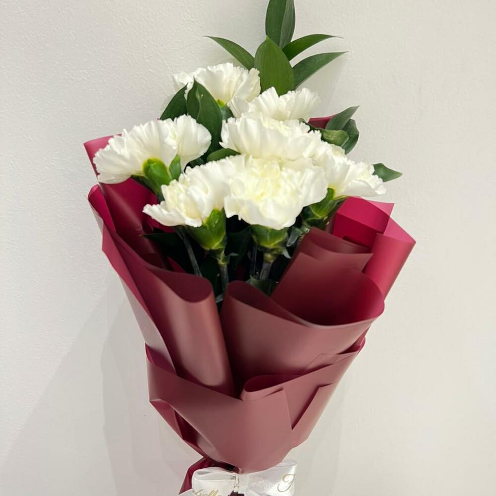 7 œillets blancs, 4 ruscus simples