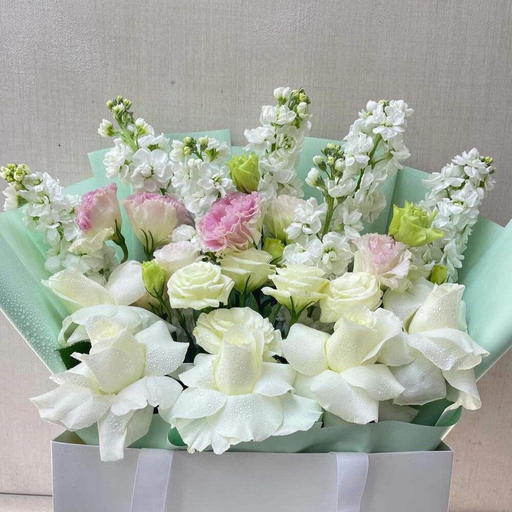 White rose - 5 pce matthiola blanche - 7 pce lisianthus blanc - 4 pce lisianthus rose et blanc - 4 pce