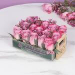 15 roses violet foncé, 1 tige de fleurs de cire rose, feuilles - 1 tige de feuilles de Parvifolia, préparées dans un plateau en bois acrylique - 20x13 cm.