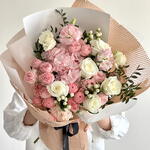 Un bouquet à couper le souffle composé d'hortensias rose pâle, de délicates roses spray et de roses blanches immaculées, dégageant une aura d'élégance et de grâce. Les nuances subtiles de rose et de blanc sont complétées par la texture singulière des baies d'hypericum blanches, tandis que les fleurs tendres du lisianthus ajoutent une touche de beauté raffinée. Parachevé par un feuillage de pistacia vert luxuriant, ce bouquet est une fusion harmonieuse de couleurs vibrantes, de textures douces et de beauté naturelle — parfait pour célébrer l'amour, la joie ou toute occasion spéciale.