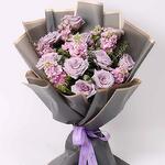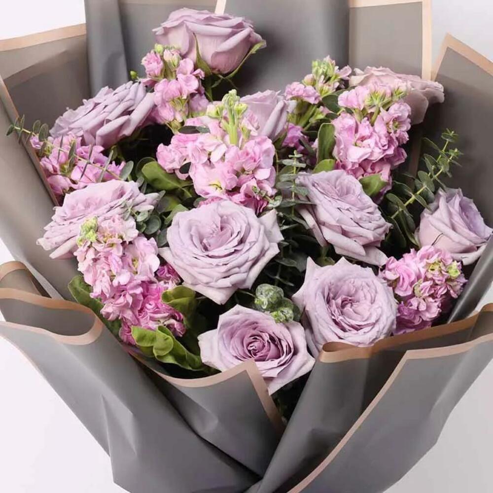 9 roses violettes 6 matthiolas roses 4 feuilles d'eucalyptus Emballage soigné et nœud en ruban