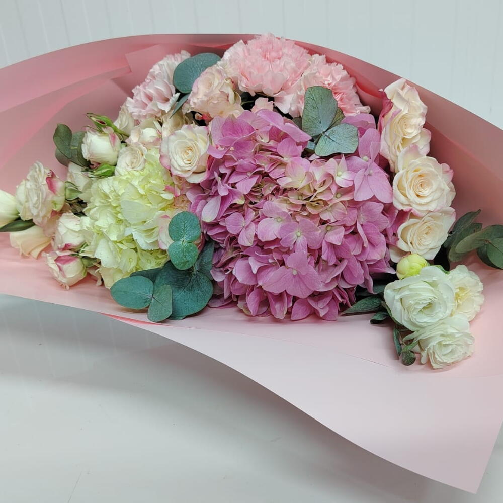 Lisianthus - 2 pce œillets roses - 3 pce hydrangea pink - 1 pce hortensia blanc - 1 pce wrapping paper - 3 pce eucalyptus leaves - 4 pce spray réflexe rose - 5 pce