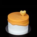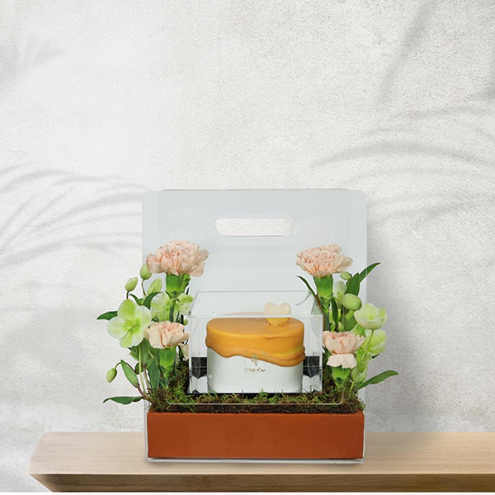 Combinaison d'œillets et d'autres fleurs avec un mini-gâteau de 300 g dans un sac en acrylique