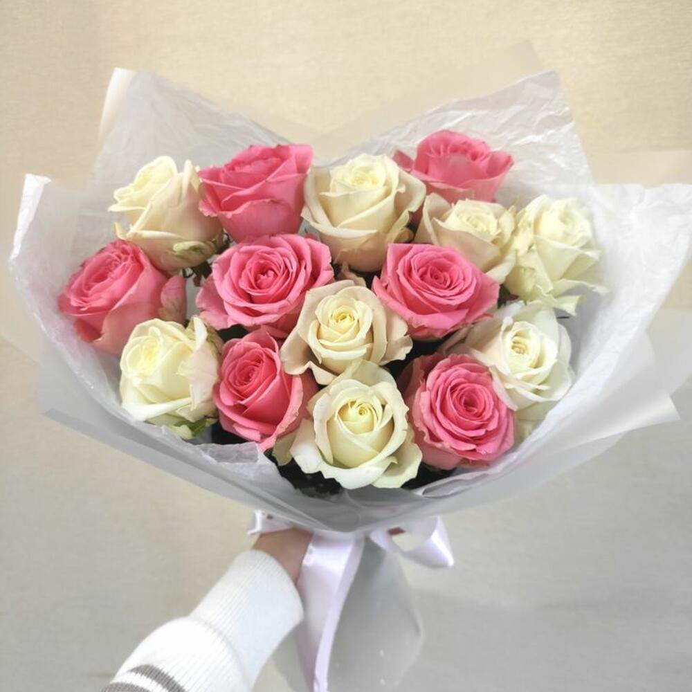 15 roses fraîches roses et blanches en pleine floraison, papier doux fait main et emballage triangulaire blanc, joli et élégant.