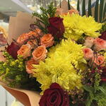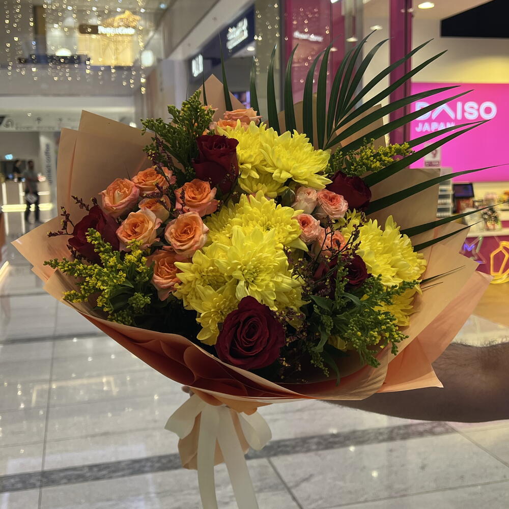 Red rose - 5 pce Spray rose - 3 pce Solidago - 4 pce Wrapping - 4 pce chrysanthème jaune - 3 pce palmier d'areca - 1 pce