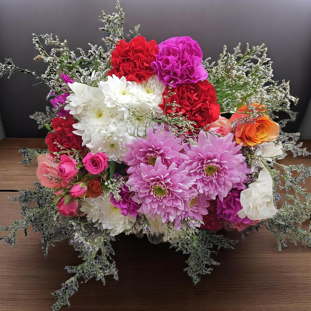 Pink rose - 5 pce Chrysanthème blanc - 4 pce œillet rouge - 5 pce chrysanthème violet - 2 pce rose bébé - 2 pce limonium - 10 pce rose orange - 5 pce
