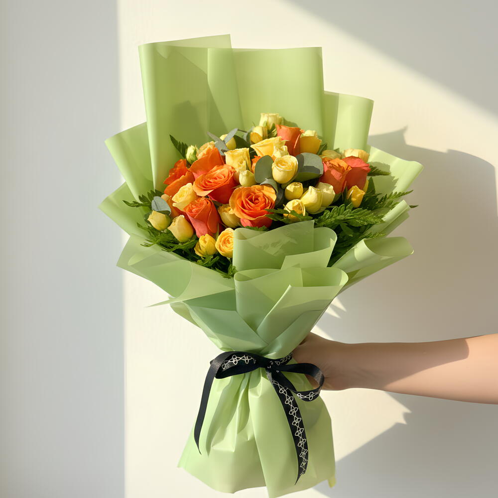 Charme d'agrumes du crépuscule est un bouquet vif et plein d'entrain, inspiré des chauds couchers de soleil dorés. Des roses d'un orange vif et d'un jaune pâle se mêlent harmonieusement, créant un contraste à la fois vivant et élégant. Rehaussé d'eucalyptus frais et d'un feuillage luxuriant, l'arrangement est enveloppé dans un élégant papier vert clair et terminé par un ruban noir raffiné pour une touche moderne.