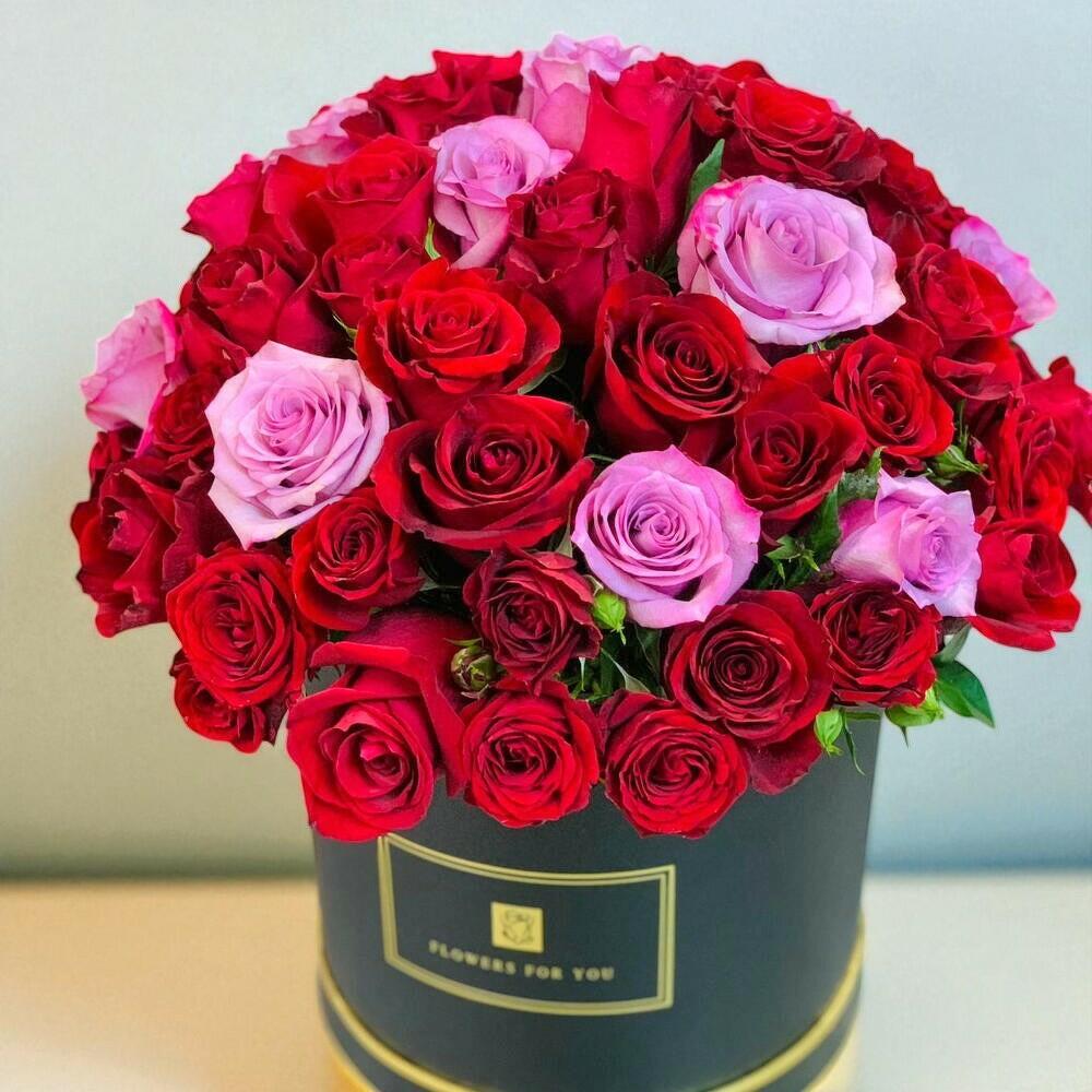 Mélange de roses rouges et pourpres 50 pièces en boîte médium 500 AED