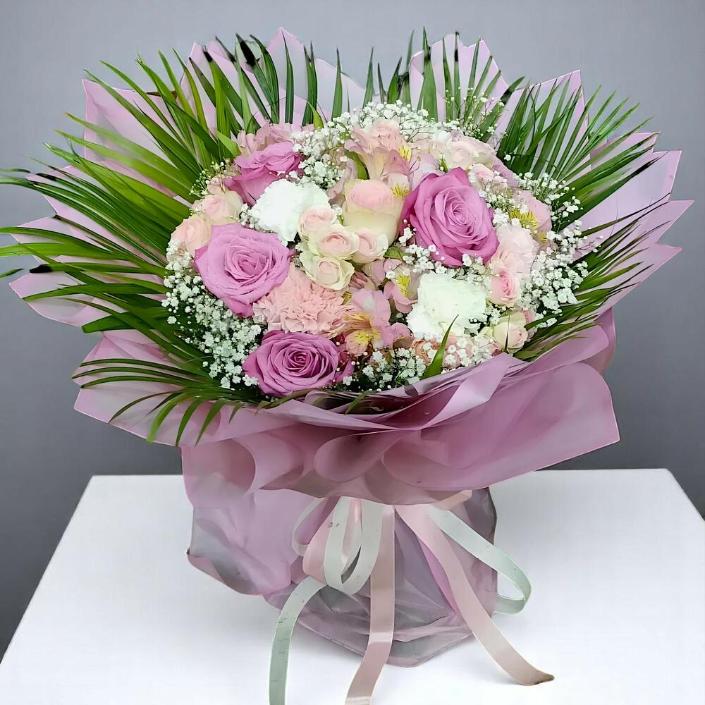 Pink rose - 5 pce Gypsophila - 10 pce rose violette - 5 pce œillets - 8 pce bébé rose rose - 5 pce palmier d'arec - 8 pce