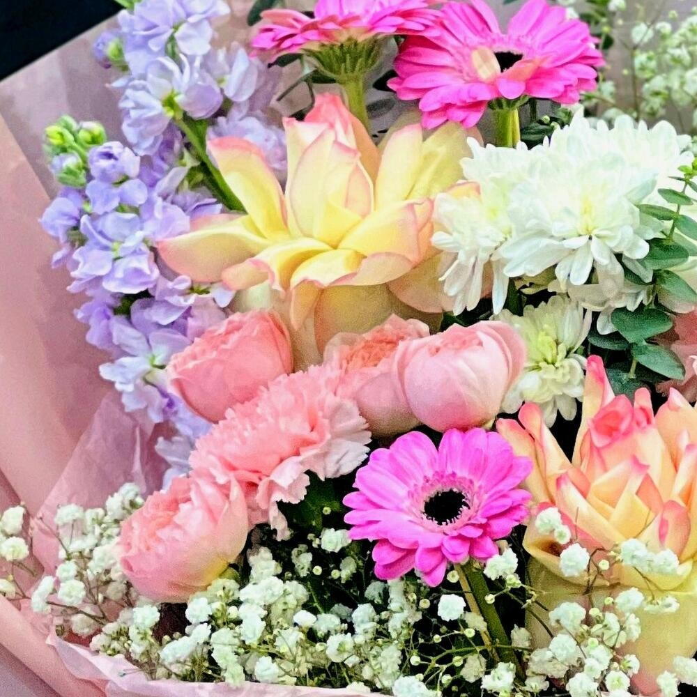 Beauté Mélangée – Bouquet Pastel Élégant avec Gérbera, Roses Plus