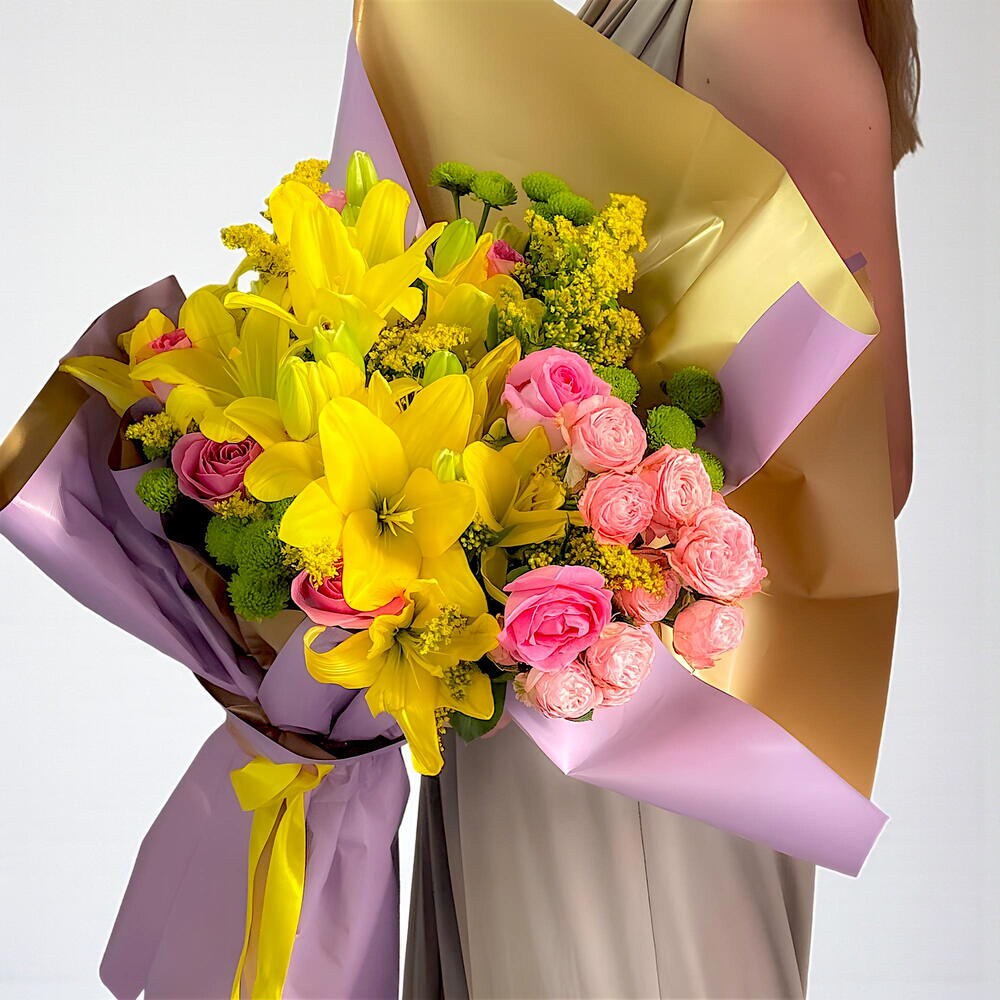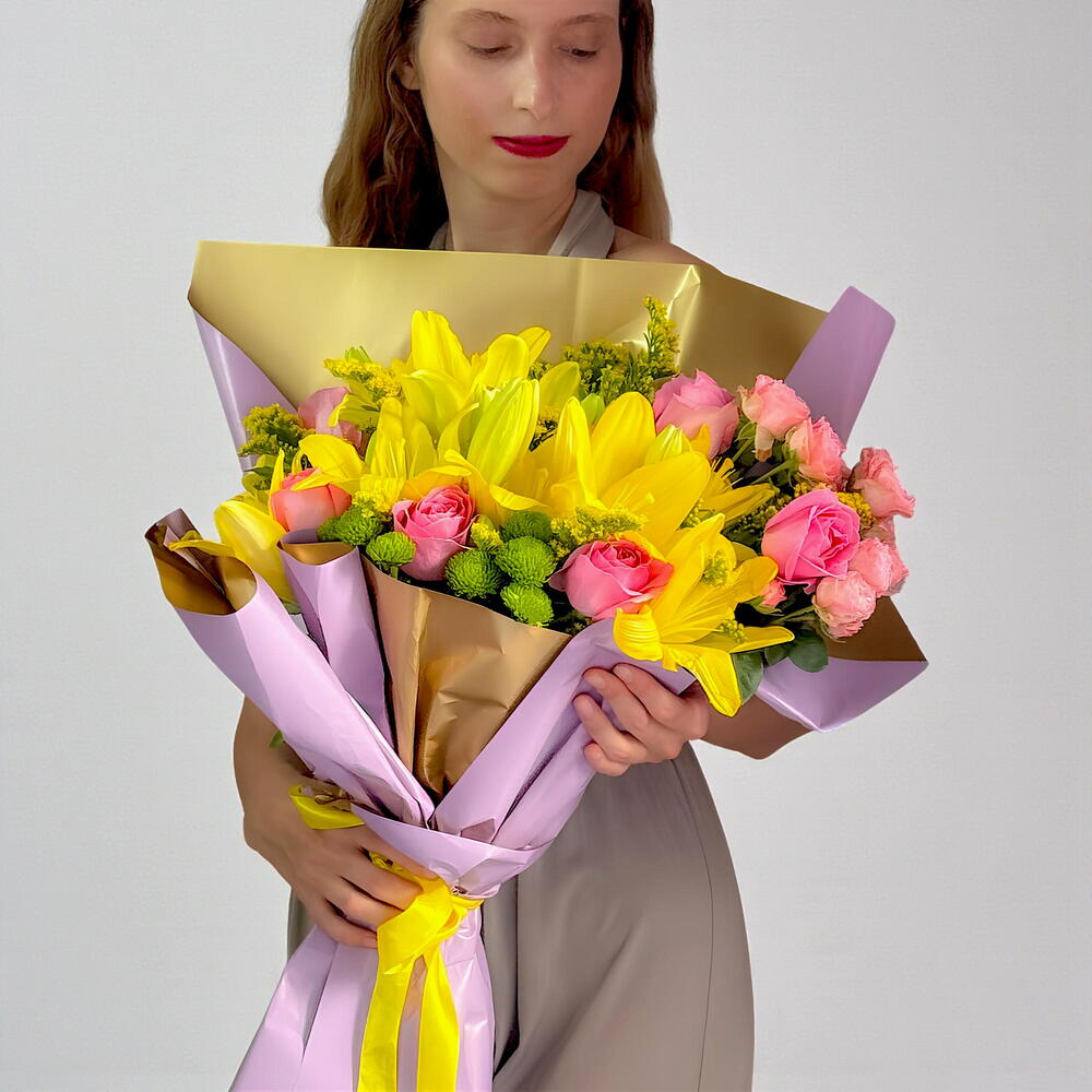 Lumineux, joyeux et plein de charme, ce bouquet de fleurs mélangées vibrantes présente une superbe association de 5 lys jaunes, 6 roses roses ravissantes, 3 rosettes roses, 3 chrysanthèmes verts et 5 solidasters jaunes. Parfaitement équilibré et élégant, ce bouquet symbolise la joie, l'admiration et l'énergie positive. Un cadeau idéal pour un anniversaire, des félicitations, des remerciements, ou tout simplement pour égayer la journée de quelqu'un avec des fleurs fraîches et éclatantes. Caractéristiques principales : Contient : • 5 lys jaunes • 6 roses roses ravissantes • 3 rosettes roses • 3 chrysanthèmes verts • 5 solidasters jaunes Fabriqué à la main avec soin et emballé dans un élégant emballage Un mélange vibrant symbolisant la joie, l'appréciation et l'harmonie Idéal pour les anniversaires, les fêtes ou les surprises joyeuses