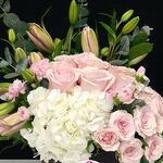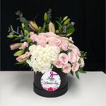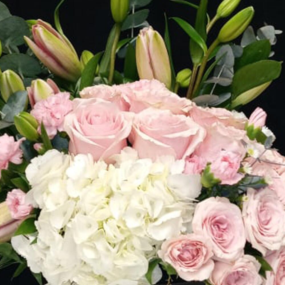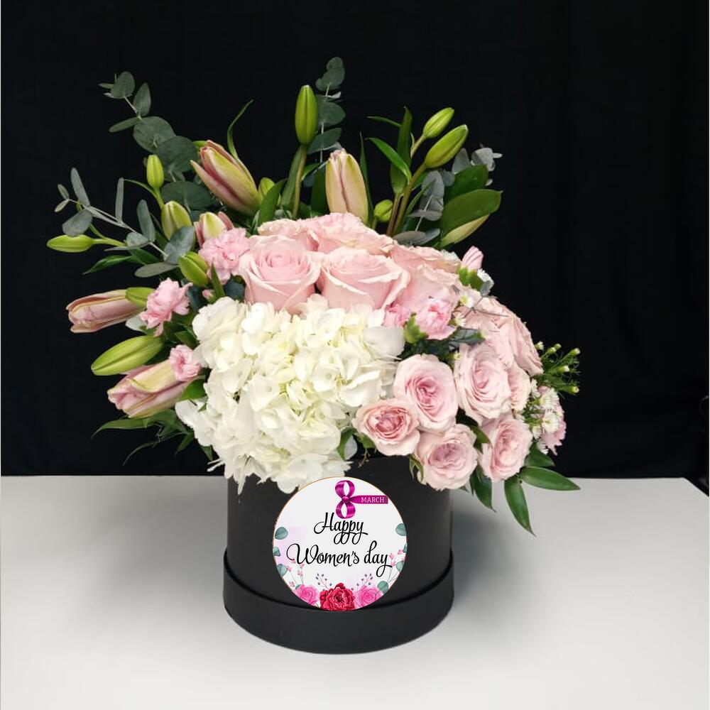 Eucalyptus - 3 pce Ruscus - 3 pce Hydrangea - 1 pce carnation - 3 pce lilly - 3 pce gypso - 3 pce roses miniatures - 3 pce pink roses - 6 pce box pour la journée internationale des femmes - 1 pce