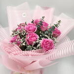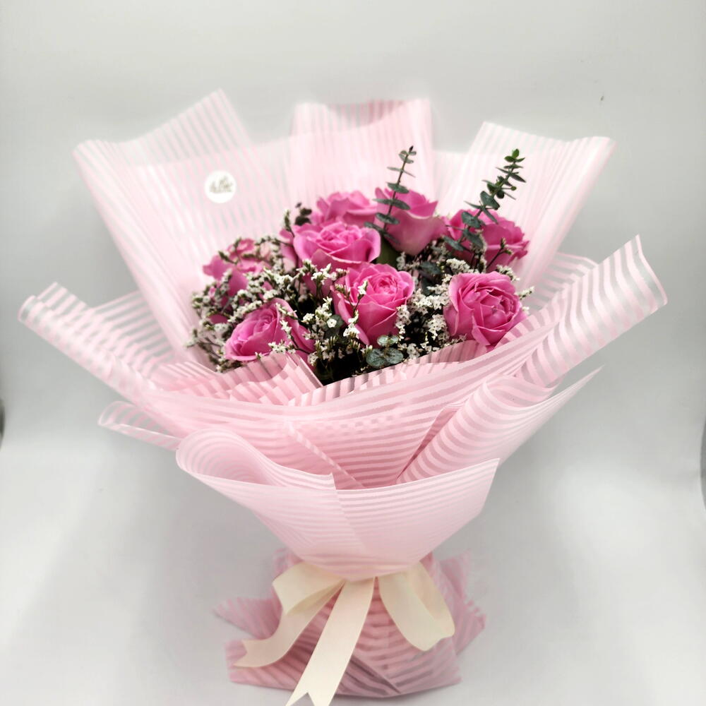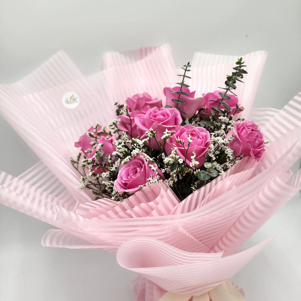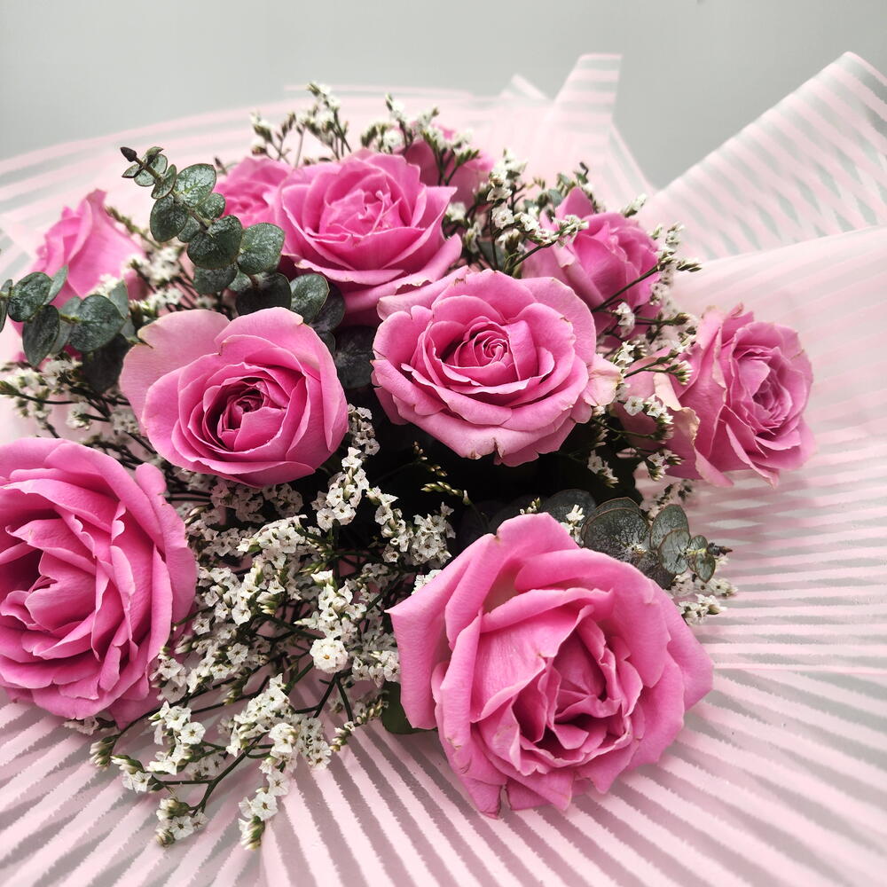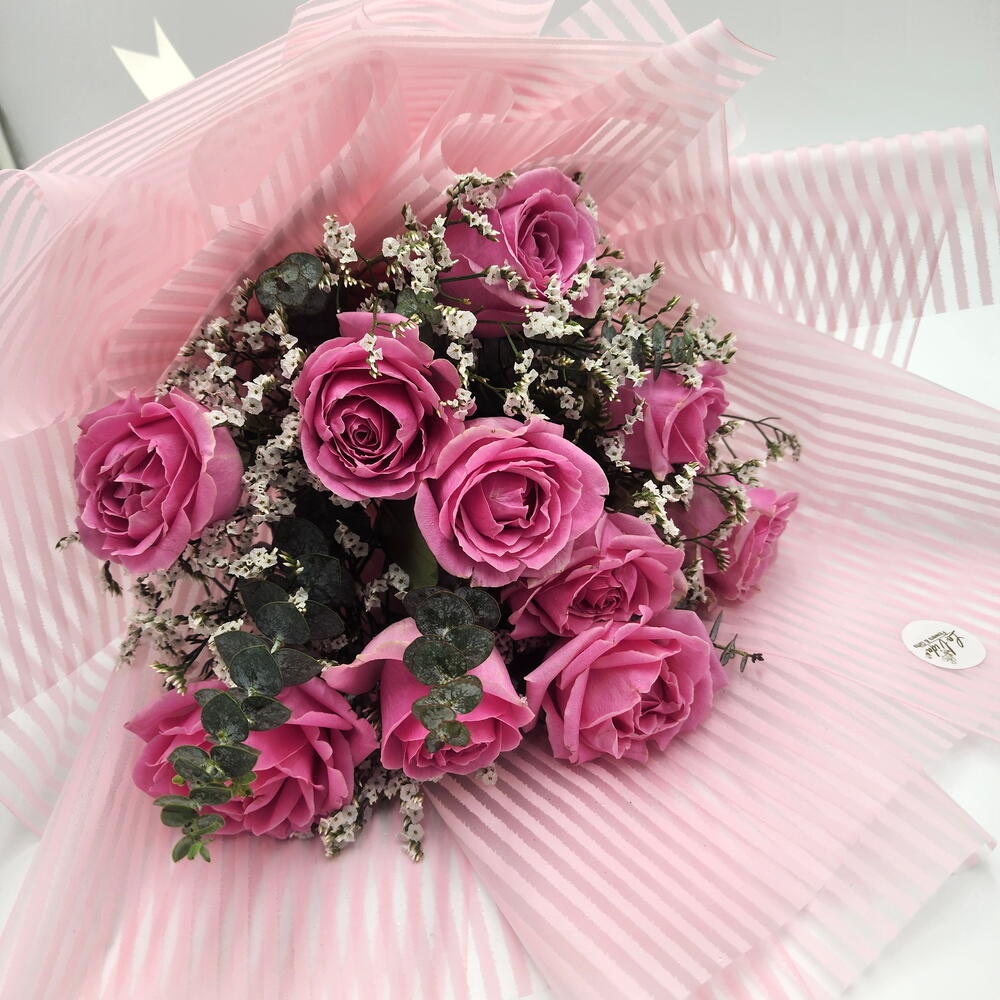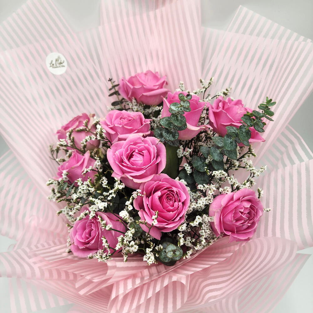 eucalyptus cineria - 2 pce limonium blanc - 3 pce pink roses - 10 pce