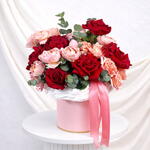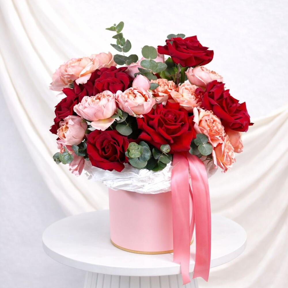 Eucalyptus - 2 pce rose rouge premium - 7 pce feuille pistache - 2 pce juliette pêche - 5 pce
