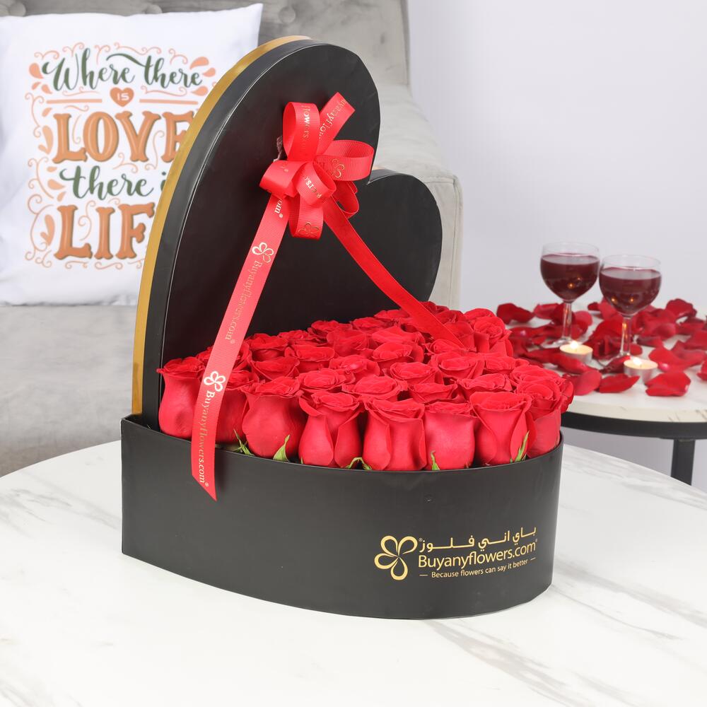 Détails du produit : 30-35 roses rouges, disposées dans une grande boîte en forme de cœur, nouée d'un ruban rouge.