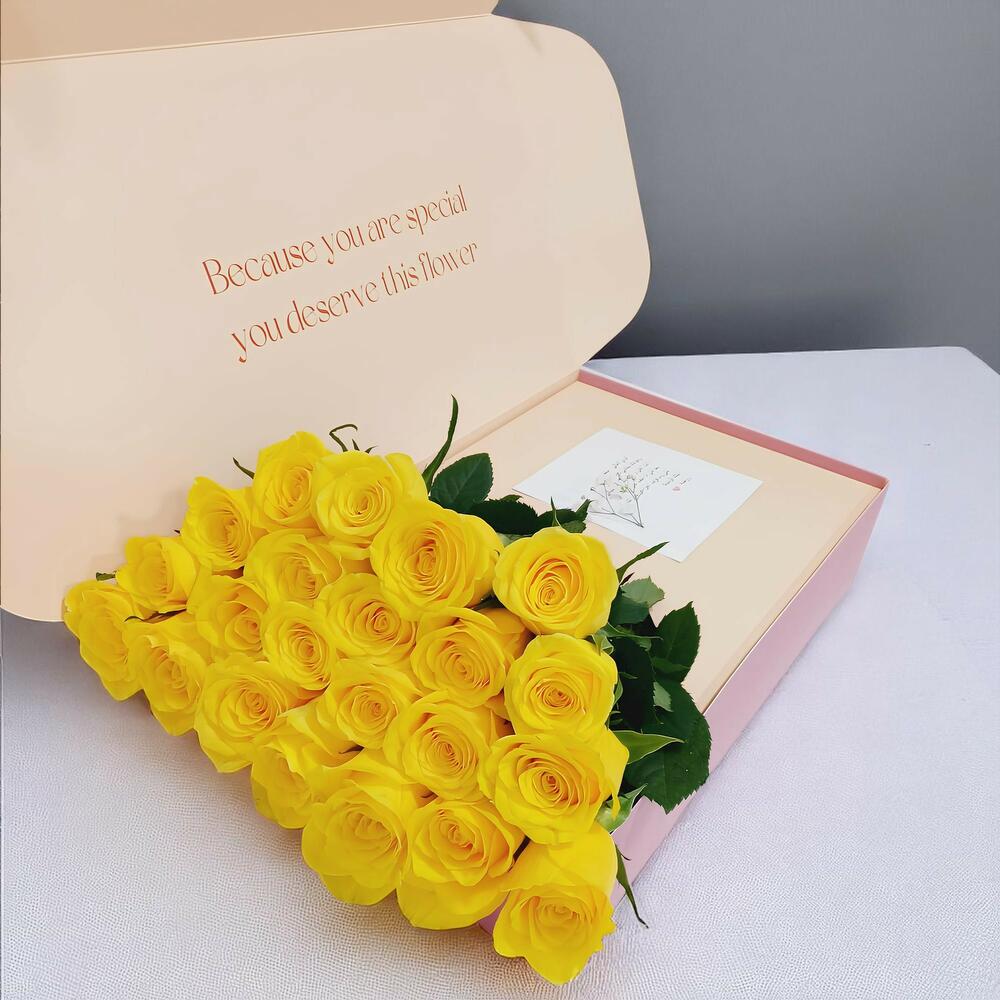 Lumineux, audacieux et plein de chaleur, Sunshine Embrace est une célébration joyeuse de l'amour, de l'amitié et de la reconnaissance. Composé de 21 roses jaunes éclatantes présentées dans une boîte-cadeau luxueuse, cet arrangement est parfait pour remonter le moral et exprimer des sentiments sincères. Qu'il s'agisse d'un anniversaire, d'un remerciement ou simplement pour faire plaisir, ce bouquet apporte du soleil dans la journée de chacun.