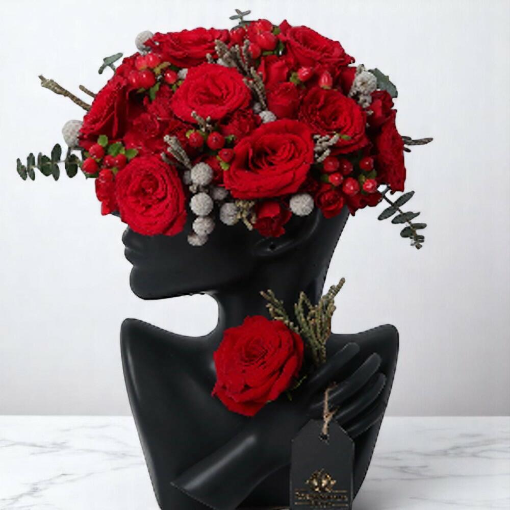 Ma Reine en Rouge – Vase Mannequin Noir Artistique avec des Roses Rouges Couronne Florale