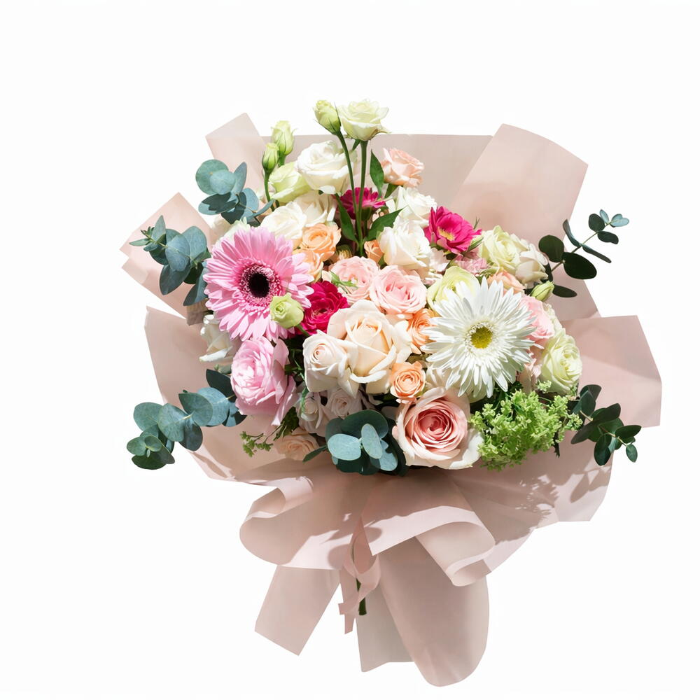 Eustoma - 2 pce Eucalyptus - 1 pce Spray rose - 5 pce Gerbera - 2 pce Pink floyd - 3 pce maman - 2 pce ohara blanc - 5 pce