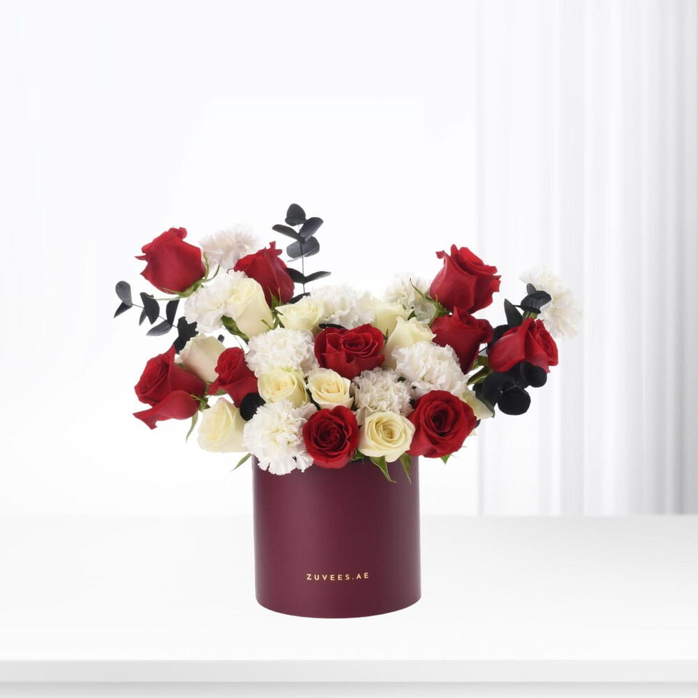 Cet arrangement raffiné comporte 10 roses rouges symbolisant une affection profonde, accompagnées de 10 roses blanches représentant la pureté et l'unité. Rehaussé de 9 œillets blancs pour la douceur et de 4 tiges d'eucalyptus noir pour la profondeur et la structure, il reflète l'harmonie, l'élégance et les émotions. Disponible dans la ZUVEES Signature Box.