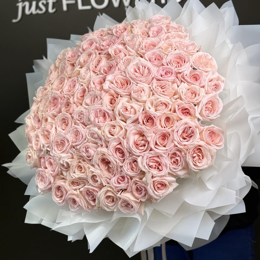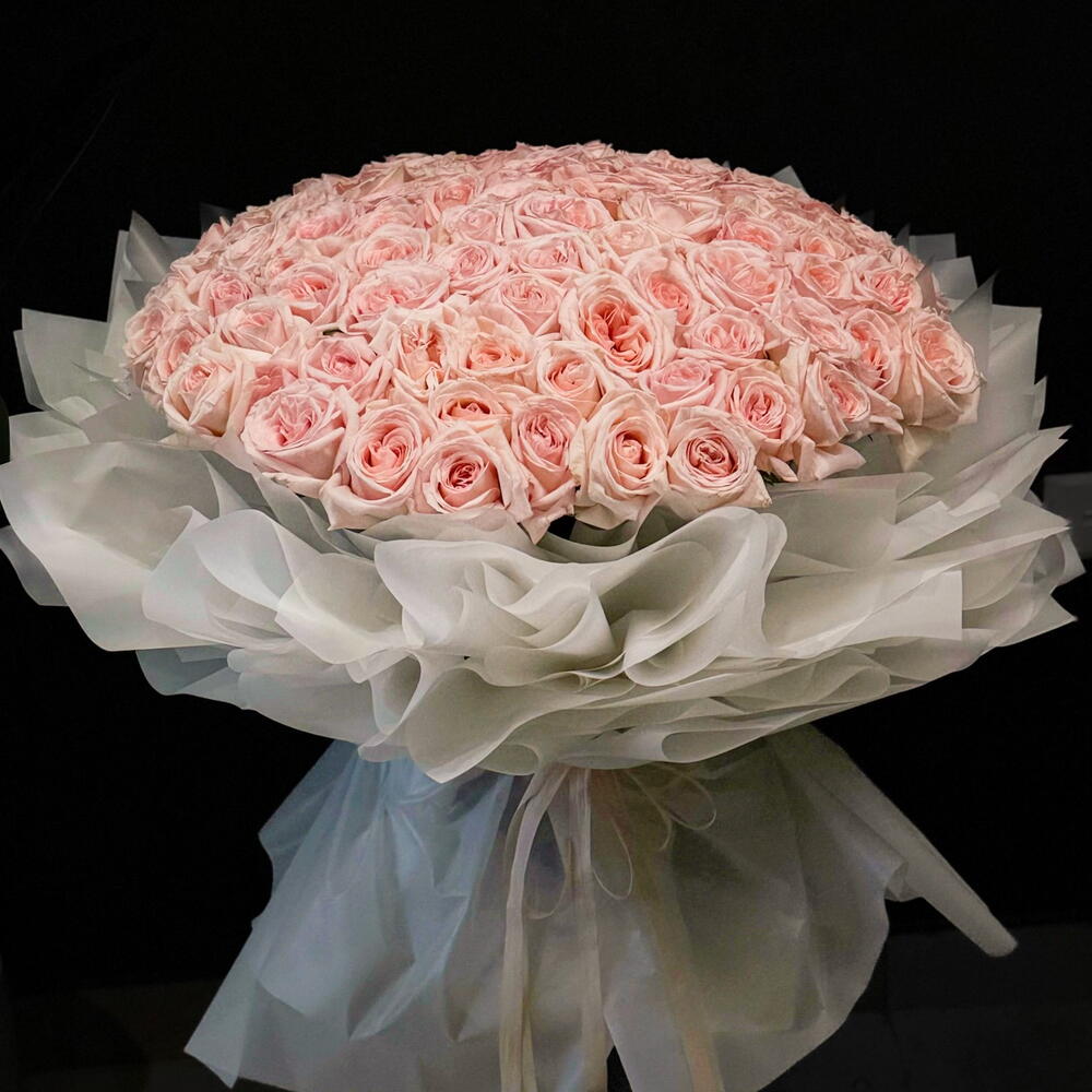 Un arrangement à couper le souffle de roses Ohara de qualité supérieure en rose poudré, élégamment enveloppé dans des couches de papier blanc délicat et noué d'un ruban de satin. Ce grand bouquet met en valeur les pétales luxuriants et épanouis ainsi que le parfum délicat qui font des roses Ohara un symbole intemporel de grâce et de romance. Parfait pour les occasions spéciales, les anniversaires ou pour exprimer des sentiments sincères de la manière la plus élégante.