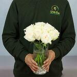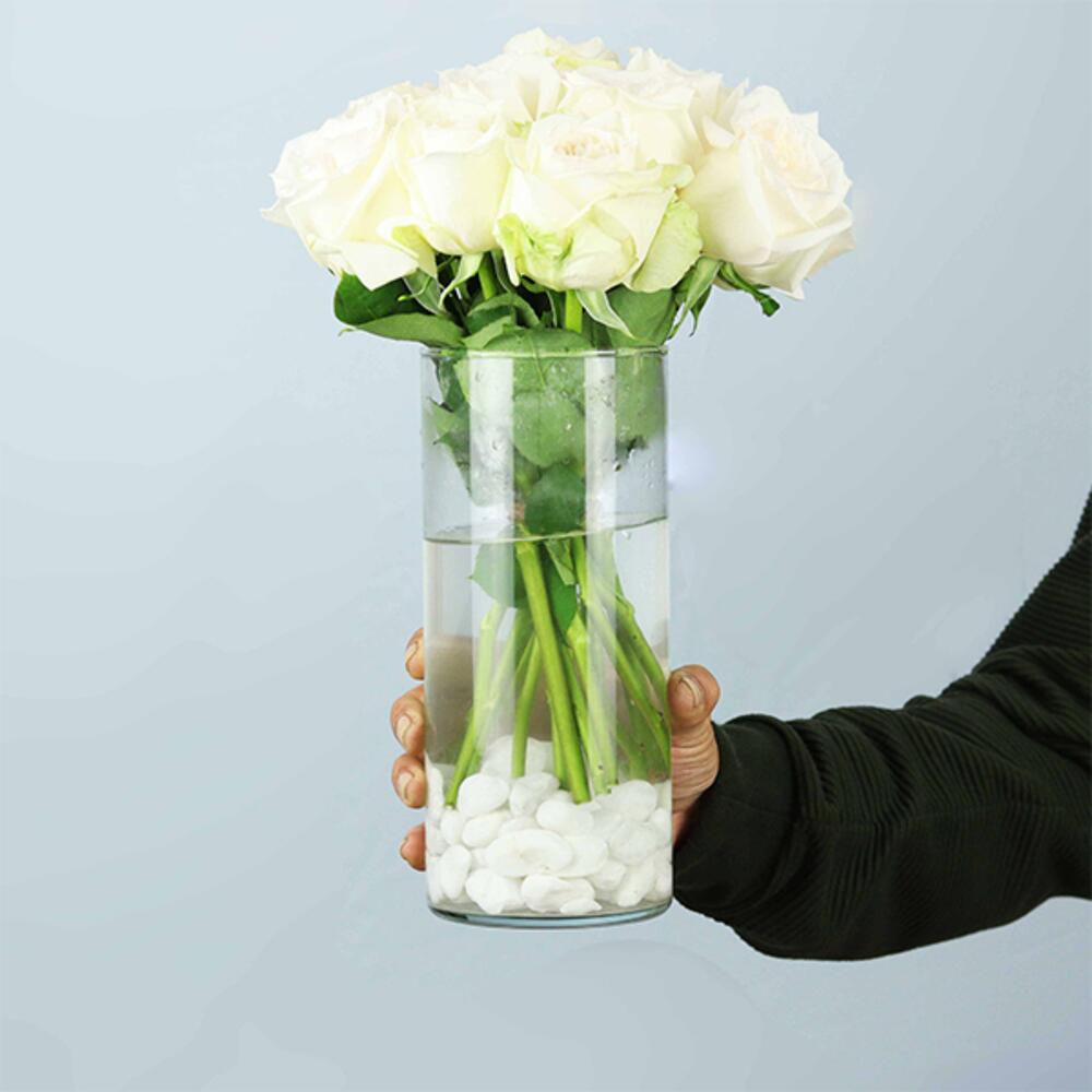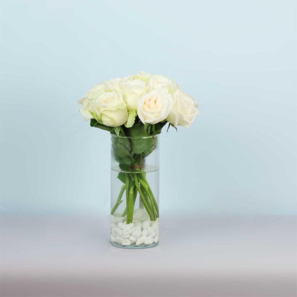 10 roses Ohara disposées dans un vase cylindrique en verre.