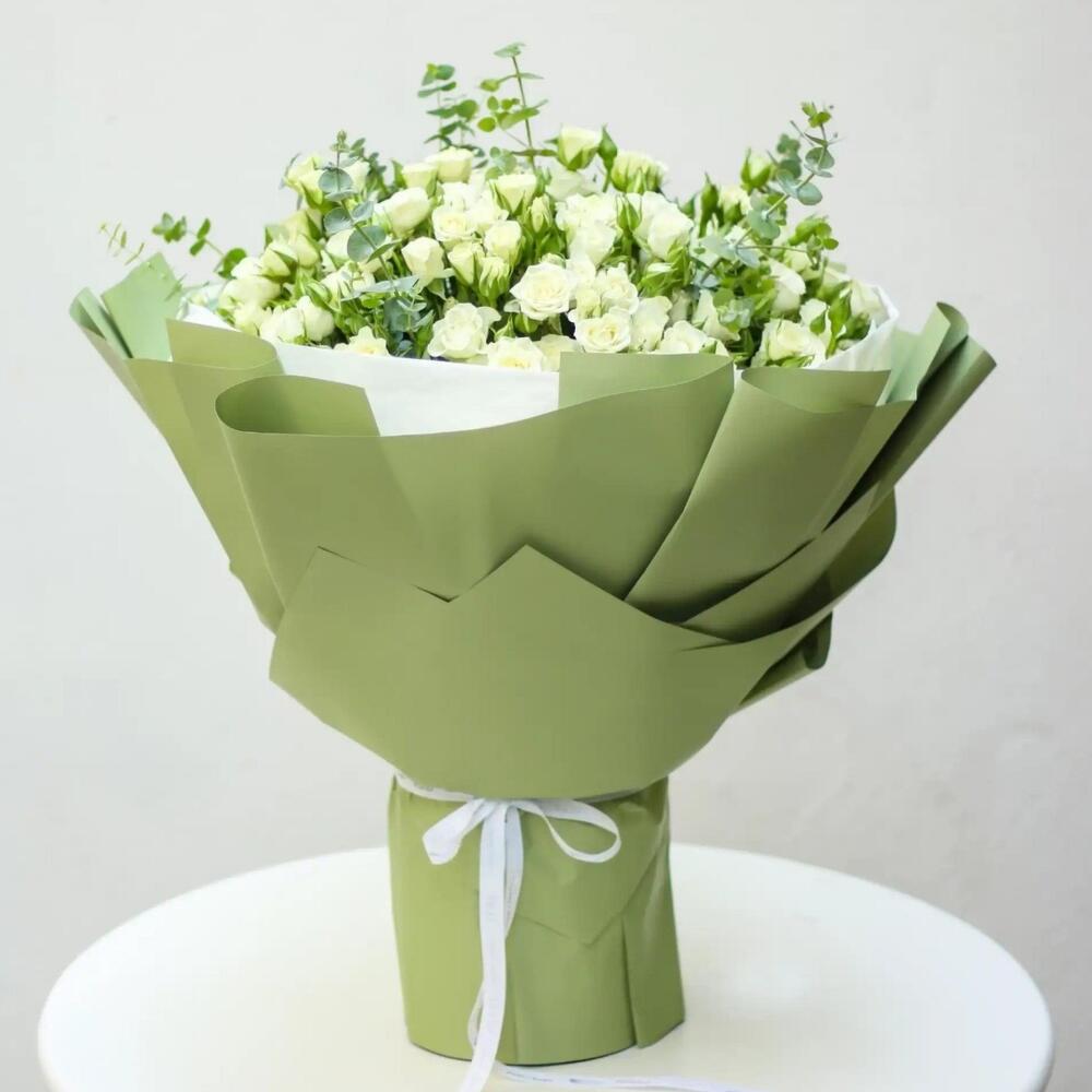 Jardin d'Olives – Bouquet de Roses Crème Sereines Plongez dans le calme du Jardin d'Olives, où 100 roses crème rencontrent la fraîcheur de l'eucalyptus, le tout enveloppé dans un papier vert olive orné d'un délicat ruban. Inspiré des oliveraies méditerranéennes, ce bouquet est un cadeau luxueux qui évoque élégance et sérénité. Parfait pour • Des attentions romantiques pour votre petite amie ou votre épouse • Des surprises attentionnées pour votre mère ou vos proches • Des anniversaires, des fêtes de fin d'année ou des célébrations luxueuses Pourquoi vous allez l'adorer ? • Des roses crème et de l'eucalyptus cueillis à la main pour un charme durable • Un emballage vert olive pour une présentation sereine et élégante • Un cadeau luxueux, sophistiqué et mémorable
