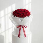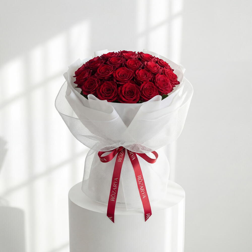 Une composition parfaitement conçue de fleurs rouges profondes, enveloppée d'un élégant filet blanc pour laisser la beauté intemporelle des roses s'exprimer. • Veuillez noter : Étant des produits naturels, les fleurs peuvent présenter de légères variations de couleur par rapport aux images numériques en raison de la croissance saisonnière et des conditions d'éclairage. Nous garantissons que le style général, la qualité supérieure ainsi que la fraîcheur de votre composition seront toujours préservés.
