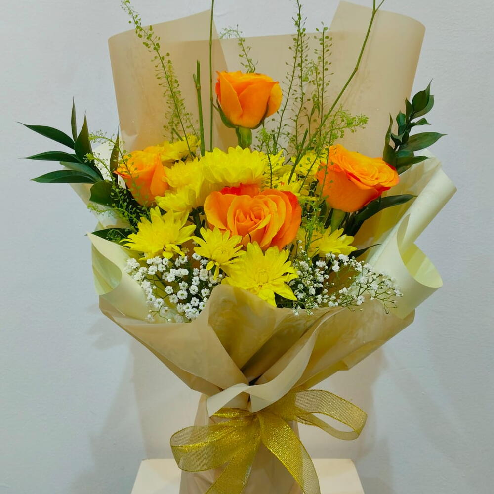 Roses orange avec chrysanthèmes jaunes, gypsophiles et feuillage