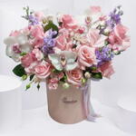 Le bouquet Orchid Bliss est une composition époustouflante composée d'une luxueuse association de roses roses délicates, de rosettes branchues et d'élégantes orchidées blanches. Rehaussé de fleurs violettes douces et de verdure fraîche, ce bouquet évoque sérénité et sophistication. Présenté dans une élégante boîte à chapeau, il est parfait pour les occasions spéciales comme les mariages, les anniversaires, ou pour exprimer des émotions profondes. Les douces teintes de rose poudré, de lavande et de blanc créent un équilibre harmonieux.