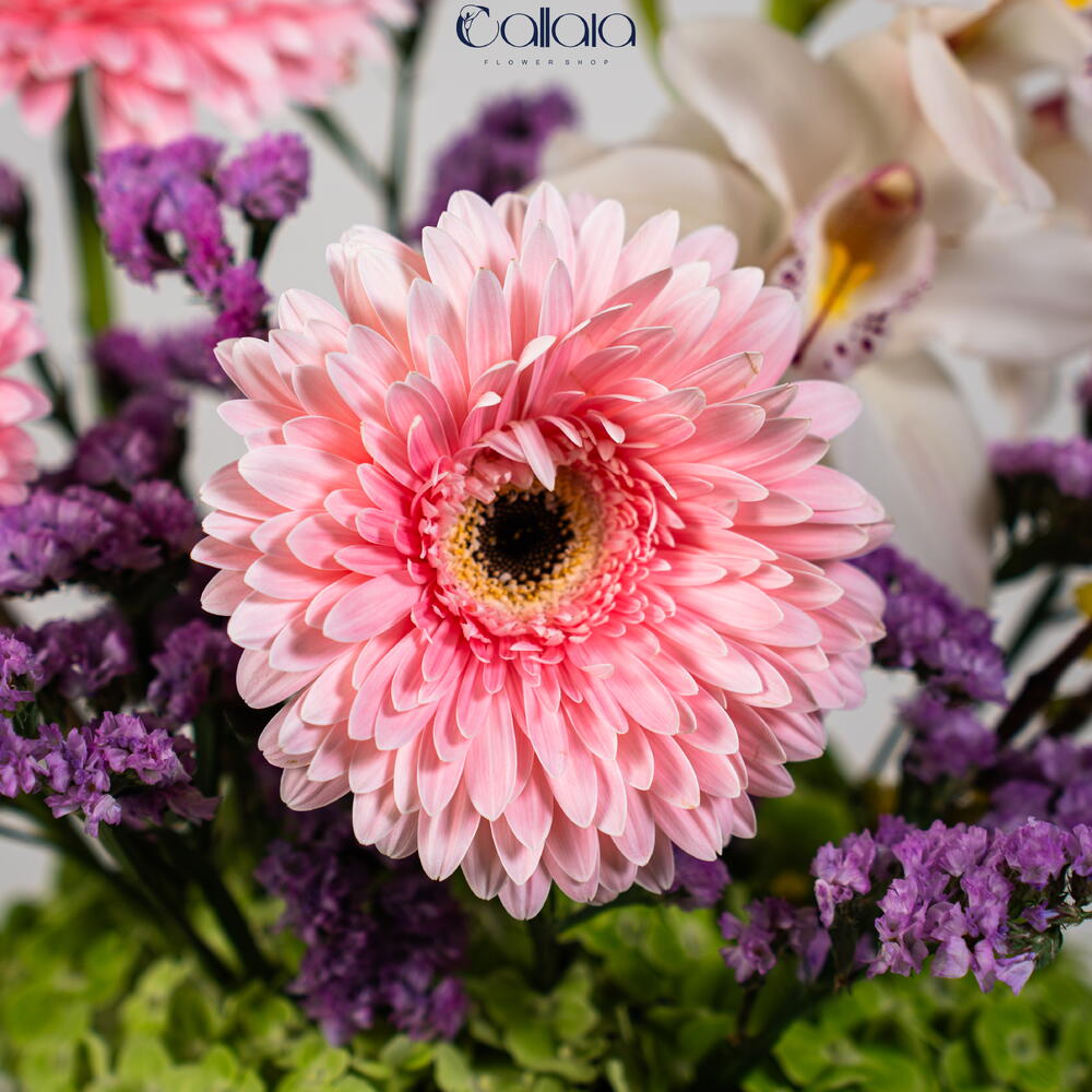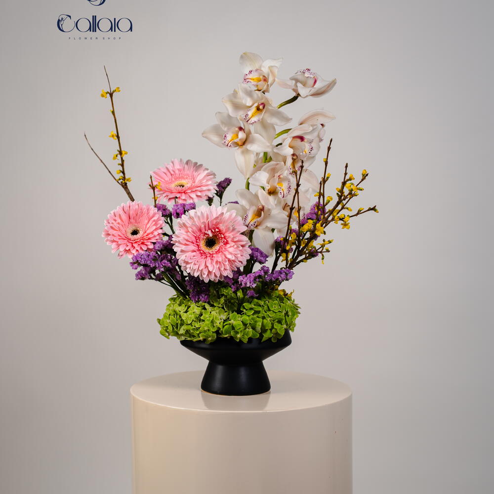 Cymbidium blanc - 1 pce hortensia vert - 2 pce statice rose - 2 pce gérbera rose - 3 pce vase noir - 1 pce Forysthia spectablis - 1 pce