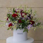 Arrangement en boîte de 10 tiges de roses rouges et 20 tiges d'orchidées violettes dans une boîte blanche