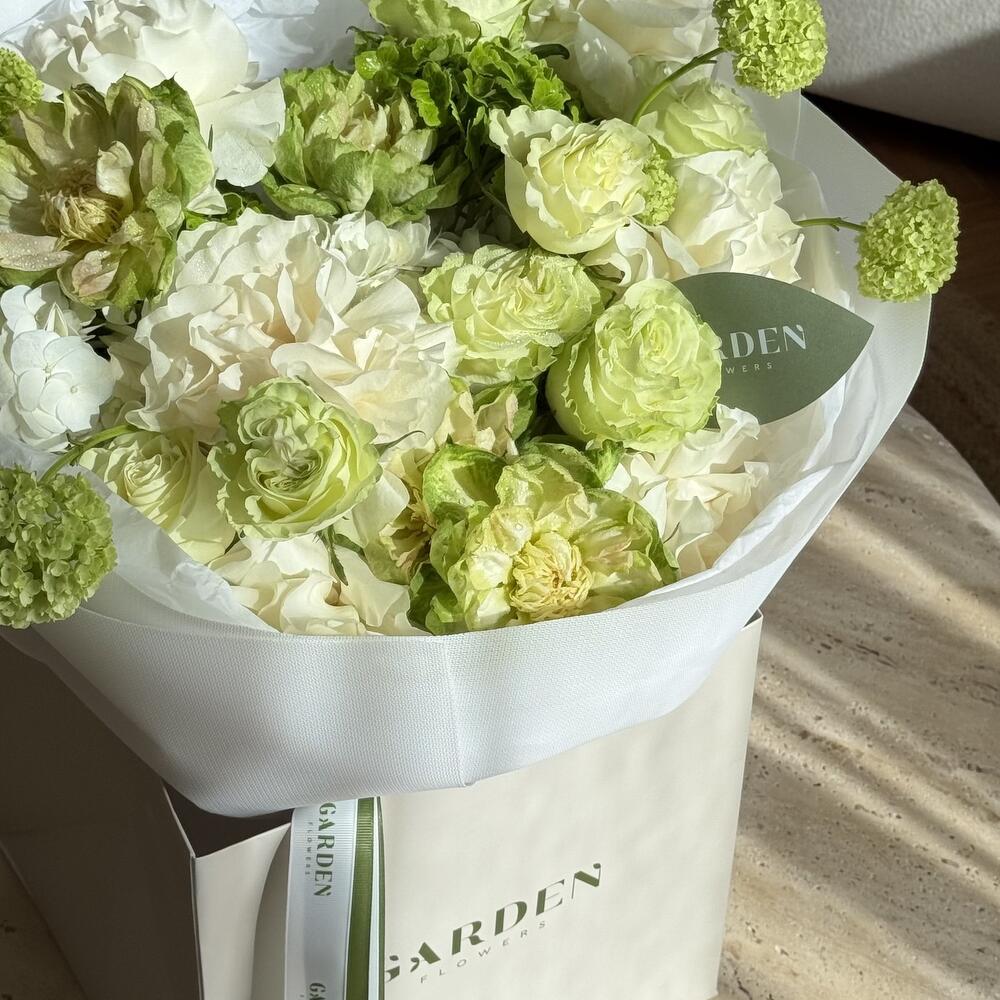 Bouquet frais dans des tons blancs et verts avec des fleurs saisonnières luxuriantes — un cadeau élégant et rafraîchissant, plein d'élégance naturelle. Comprend hortensia, viorne, rose Moonstone, rose Veggie, rose verte. Le coffret comprend une boîte aqua, un sac à fleurs, une carte, des instructions d'entretien et de l'engrais pour fleurs. *Livraison des fleurs aujourd'hui Parfait pour : - un cadeau pour elle ; - mariages ou anniversaires ; - anniversaire ; - ajouts au cadeau ; - cadeaux sans occasion.