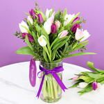 7 tulipes violettes, 7 tulipes roses, 7 tulipes blanches, feuilles - 2 tiges Palviforia, vase cylindrique en verre - 10x20cm, attaché avec un nœud de ruban violet.