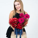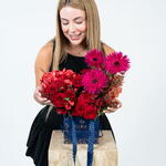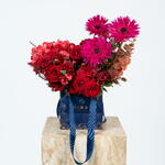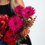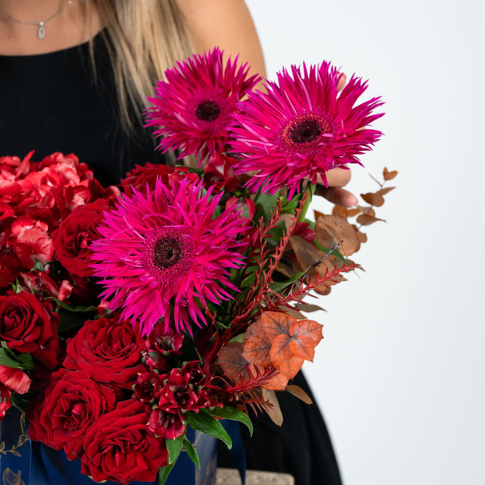 alstroemère rouge - 4 pce eucalyptus automnal - 4 pce hortensia teinté de rouge - 1 pce gérbera gerspider fuchsia - 3 pce spray rose mirabel rouge - 4 pce