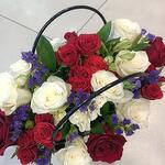 Cet arrangement floral saisissant et élégant présente un magnifique mélange de roses classiques rouges et blanches. Parfaitement présenté dans un cabas blanc immaculé aux poignées noires audacieuses, ce design moderne est un cadeau sophistiqué et réfléchi. De délicats accents violets ajoutent une touche de couleur, faisant ressortir le rouge vibrant et le blanc pur, transmettant un message d'amour et de respect.