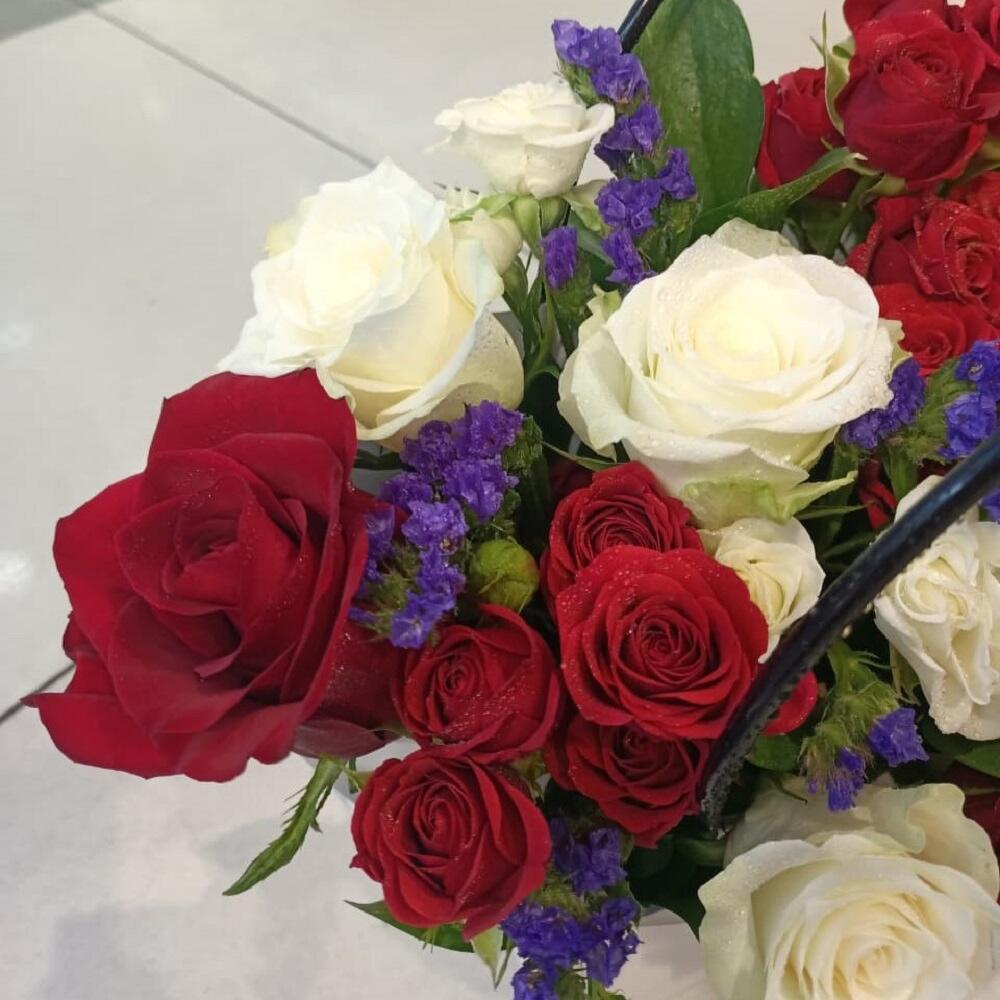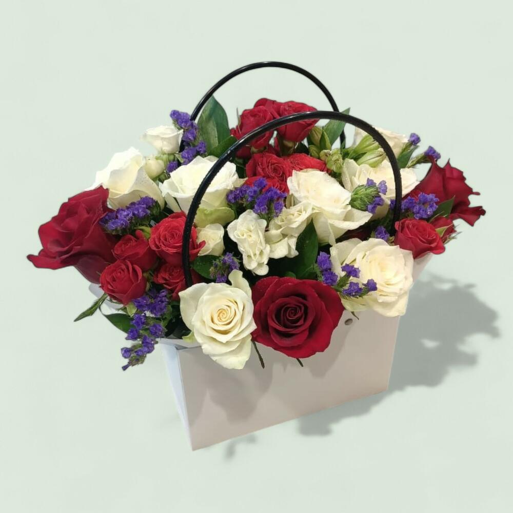 Cet arrangement floral saisissant et élégant présente un magnifique mélange de roses classiques rouges et blanches. Parfaitement présenté dans un cabas blanc immaculé aux poignées noires audacieuses, ce design moderne est un cadeau sophistiqué et réfléchi. De délicats accents violets ajoutent une touche de couleur, faisant ressortir le rouge vibrant et le blanc pur, transmettant un message d'amour et de respect.