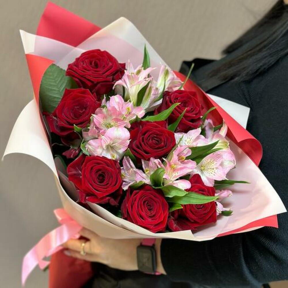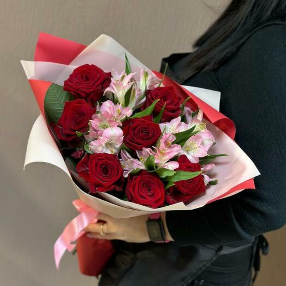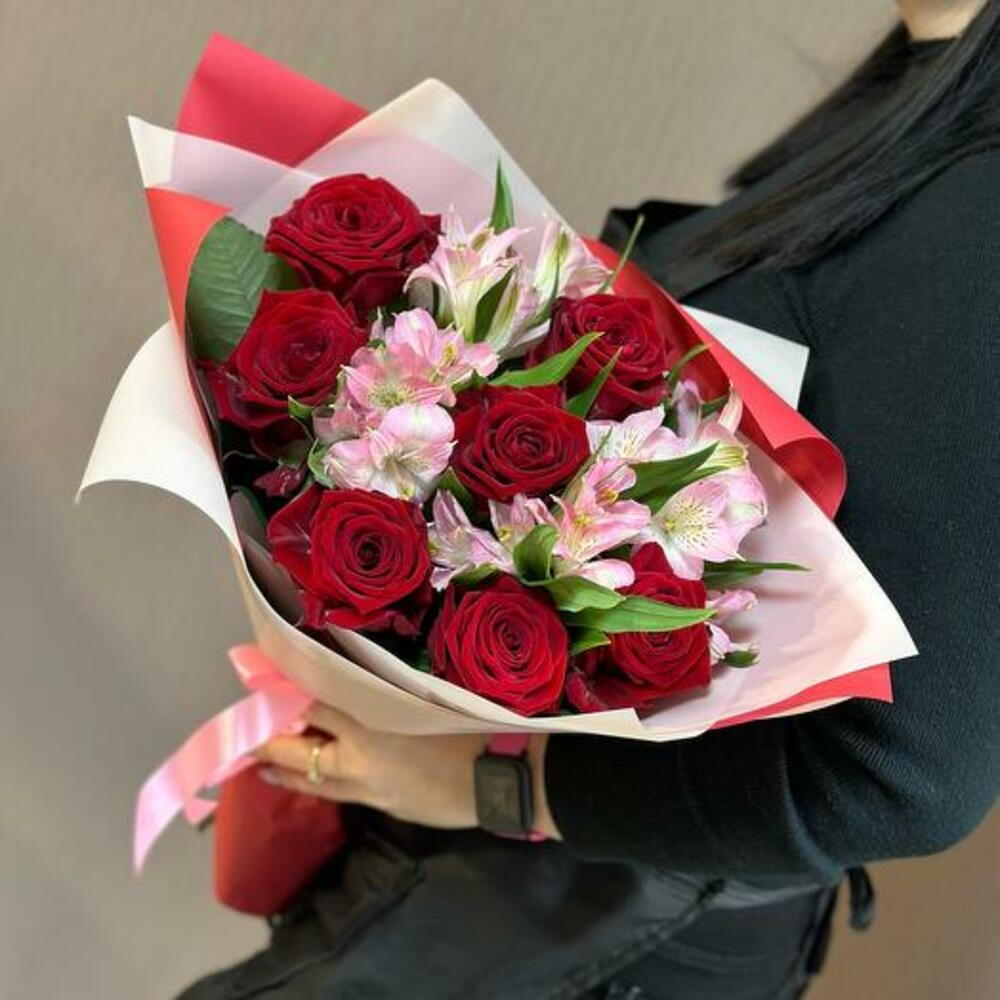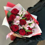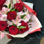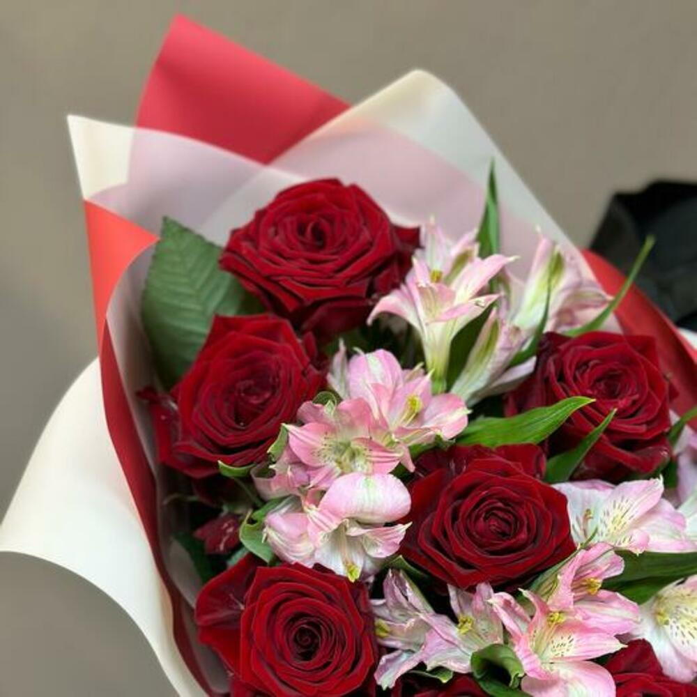 Red rose - 7 pce Satin ribbon - 1 pce Alstroemeria - 4 pce packaging - 1 pce