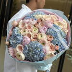7 Hortensia bleu clair, 23 Rose Pink Rabbit, 15 Pivoine Sarah, 9 Renoncule super rose pâle, 9 Rose spray berlin. Conçu dans un style de bouquet premium XL (50–60 cm) avec un emballage élégant et une finition ruban.
