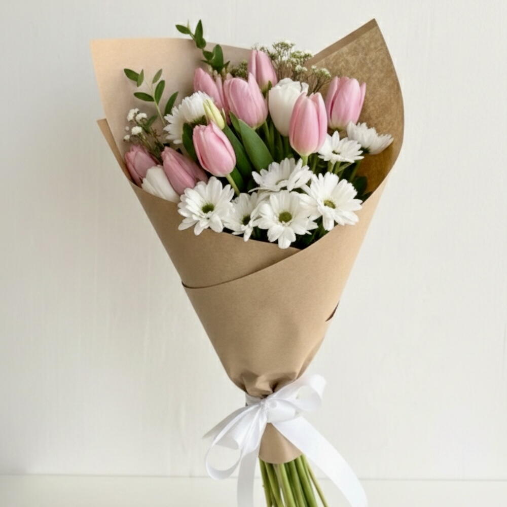 Un bouquet frais d'inspiration printanière, composé de 8 tulipes roses, 2 tulipes blanches et 3 chrysanthèmes blancs. Léger, élégant et plein d'un doux charme saisonnier.