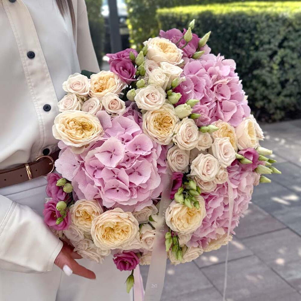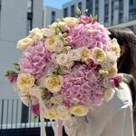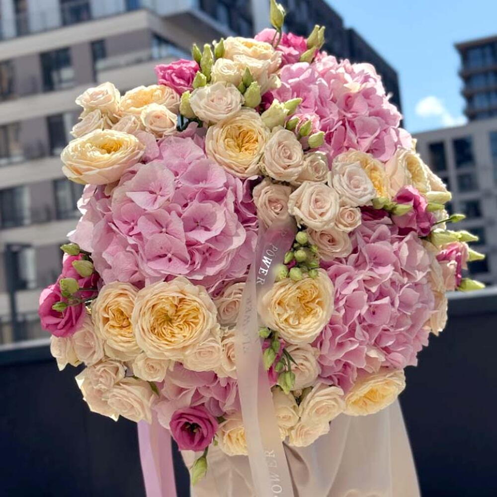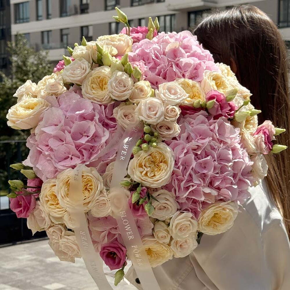 Symphonie Pastel : Grand bouquet de roses de jardin, hortensias et roses spray